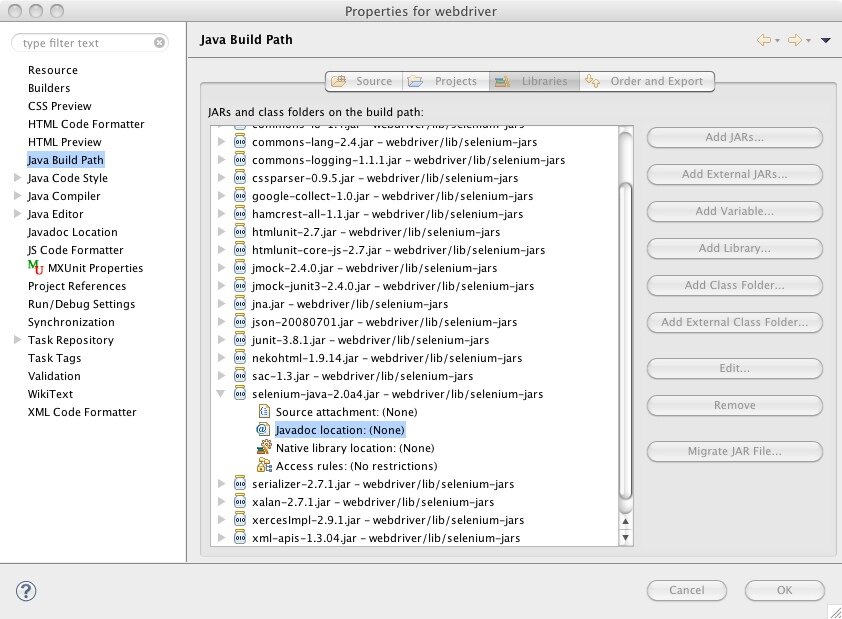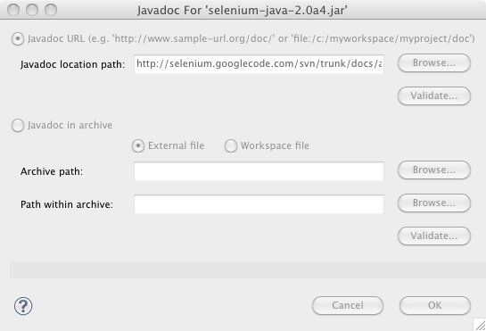 - Choose the primary selenium jar, which in this example is selenium-java-2.0a4.jar, click the down triangle and double-click on Javadoc location. Adding a Javadoc location will add help information to code assist.