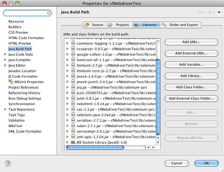 A few weeks ago during MXUnit Office Hours, Bill Shelton demonstrated using WebDriver to create functional tests in Java. It was a pretty cool demo and I meant to give it a whirl for a while, but only got around to doing it this weekend. I had to refer back to the recording of the session a number of times, so I thought it would be worthwhile to document the steps to get a project up and running in Eclipse that uses WebDriver. Let's start with some background.
