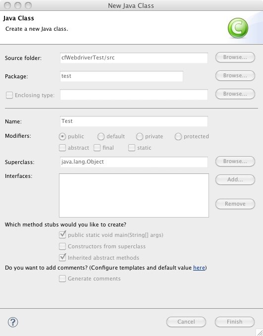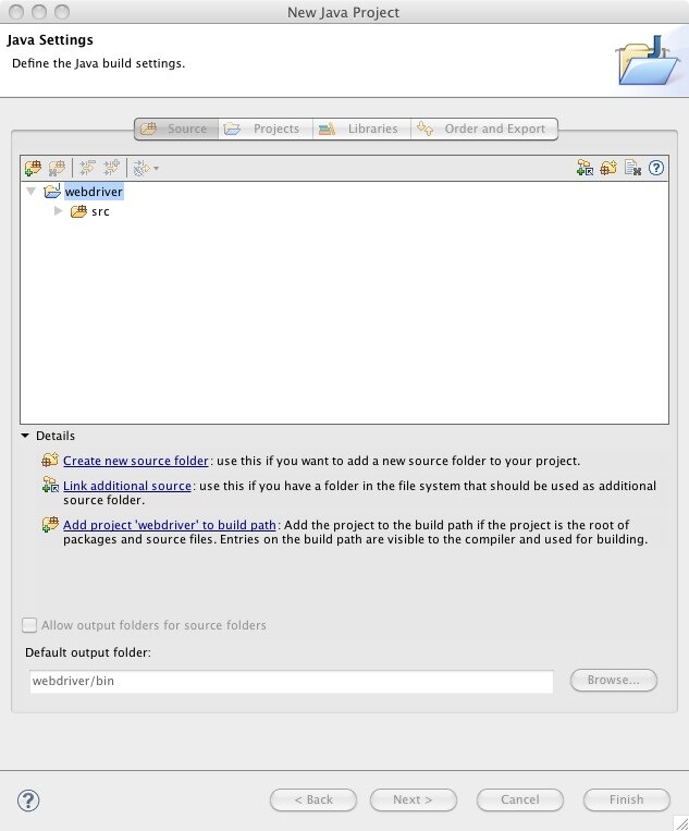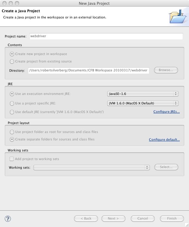 In this next step I'm going to depart from Bill's presentation and show you how to create a standalone Java project that uses WebDriver. Bill showed us how to create a JUnit test that uses WebDriver, and that is probably what you're going to want to do to create an actual functional test, but to keep things simple let's just try to get WebDriver to do something. In the next post I'll go over creating a JUnit test.