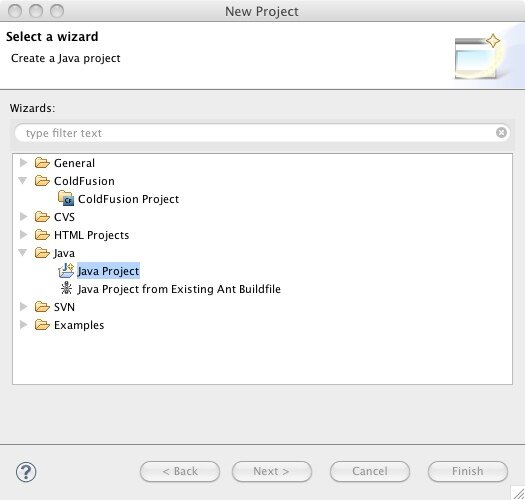 We're going to be writing Java code to drive WebDriver, so the first thing we need is a new Java project. Before starting this investigation I had written a grand total of 0 lines of Java code in Eclipse, so I didn't have a clue where to start. Luckily, as I mentioned in the opening, Bill demonstrated all of the steps for us in his presentation during MXUnit Office Hours, so I was able to just copy his steps.